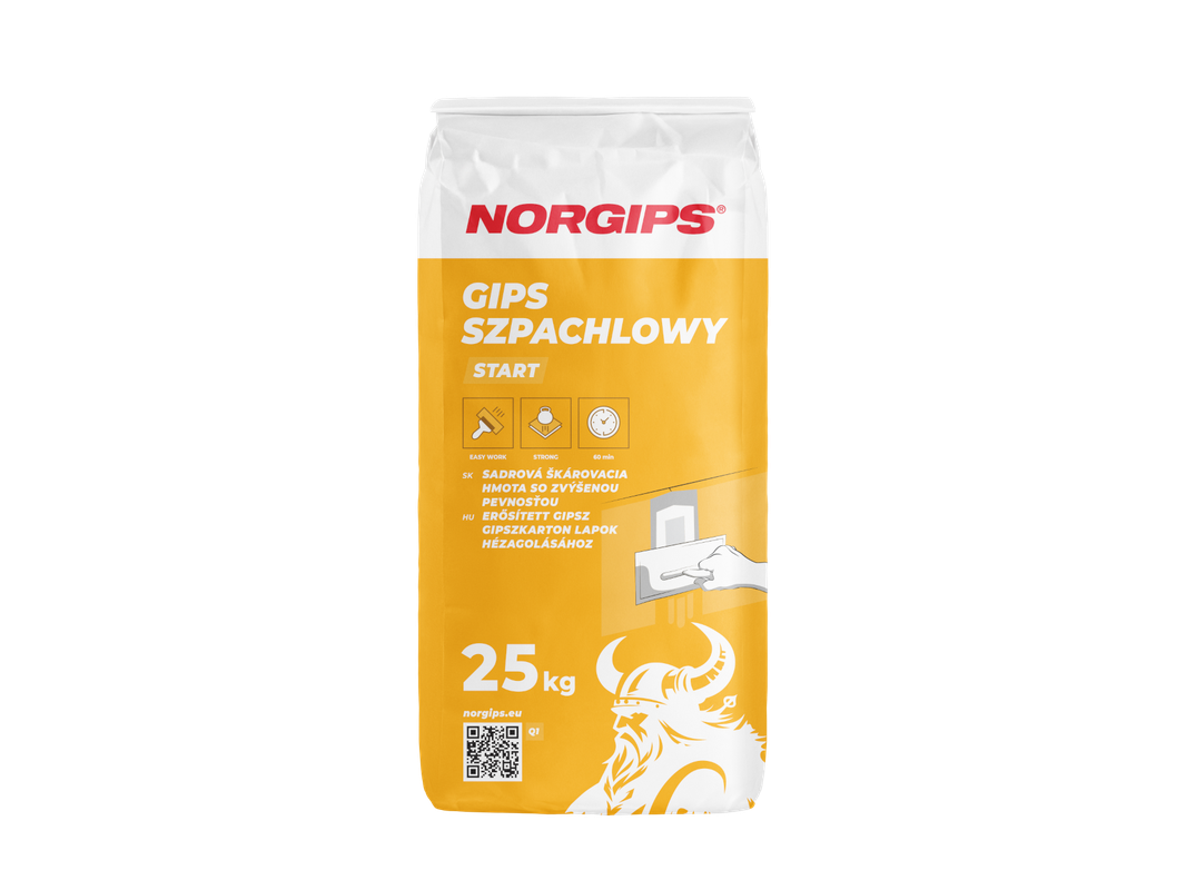 Na svislé spoje desek NORGIPS S s neupravovanými okraji naneseme stěrkovací hmotu v šířce cca 10 cm a vtlačíme do ní výztužnou pásku z papíru nebo skelného vlákna. Jakmile hmota zaschne, naneseme na spoj druhou vrstvu konstrukčního tmelu. Přestěrkujeme také otvory, kde jsou použity šrouby pro připevnění desek.